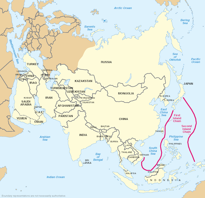 La sua posizione, appunto. L'isola di Taiwan fa parte di quella che è chiamata la prima catena di isole, ossia la prima serie di arcipelaghi principali del Pacifico al largo della costa continentale dell'Asia orientale. È composta principalmente dalle isole Curili, dall'arcipelago giapponese, dalle isole Ryukyu, da Taiwan, dalle Filippine settentrionali e dal Borneo. È considerata dagli Usa una barriera militare strategica per l'accesso al più ampio Oceano Pacifico: se Taiwan dovesse cadere nelle mani della Cina, l'Oceano Pacifico sarebbe alla mercé di quest'ultima.